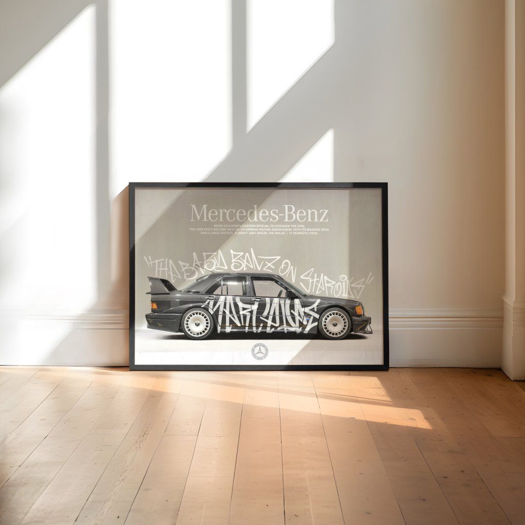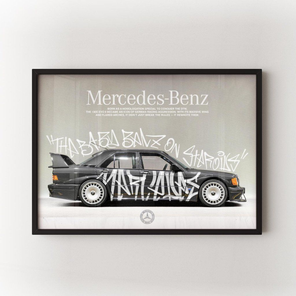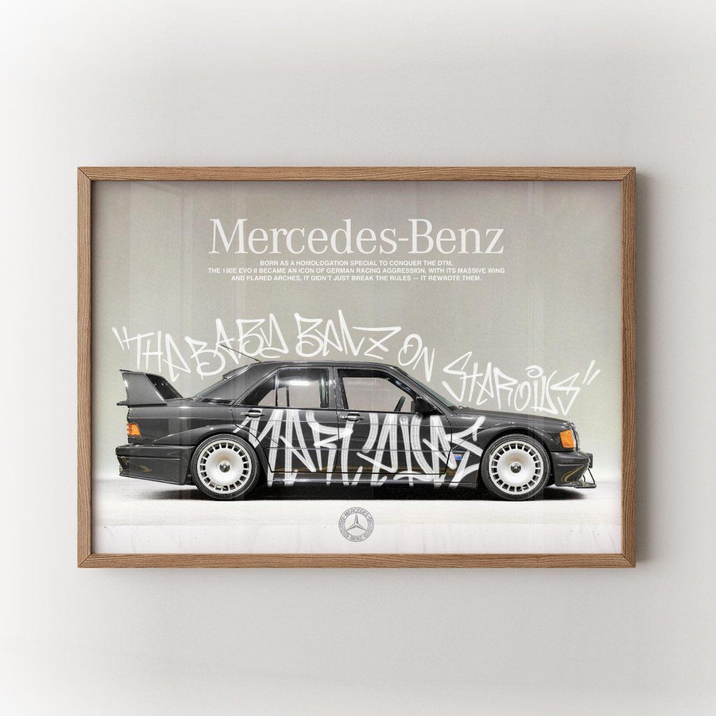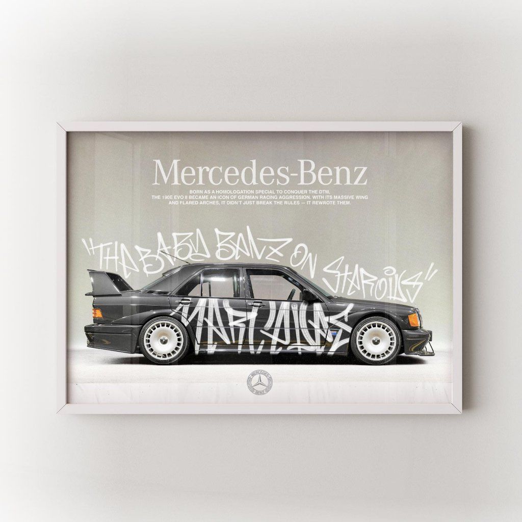 Plakát 190E Evo II zachycuje syrovou energii motorsportu, výkonu a legendárního německého inženýrství. Ikonický model Mercedes-Benz 190E Evo II symbolizuje preciznost, sílu a závodní DNA, která posunula hranice automobilového světa. Ideální pro každého, kdo žije rychlostí, stylem a vášní pro auta.
