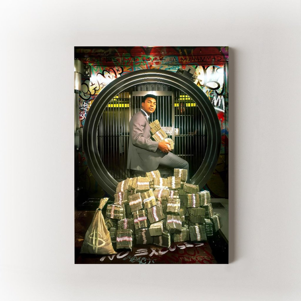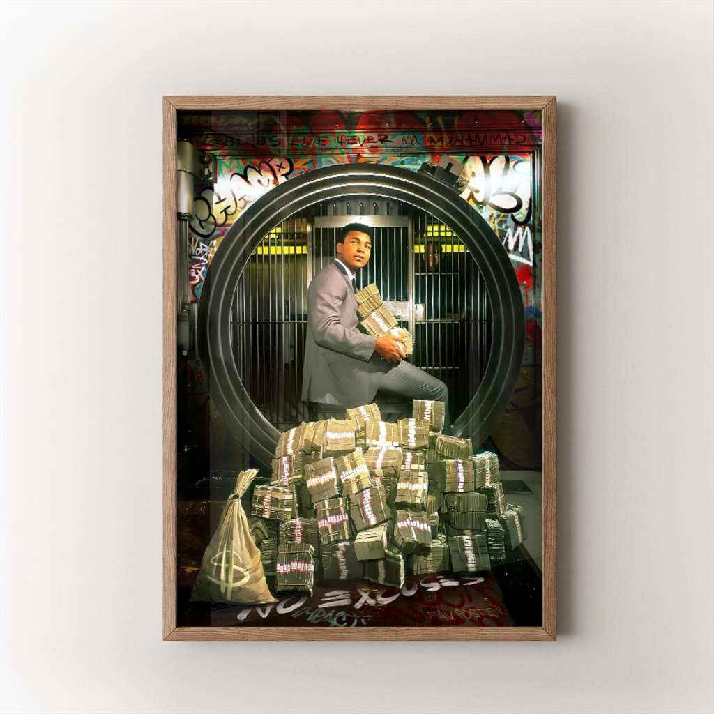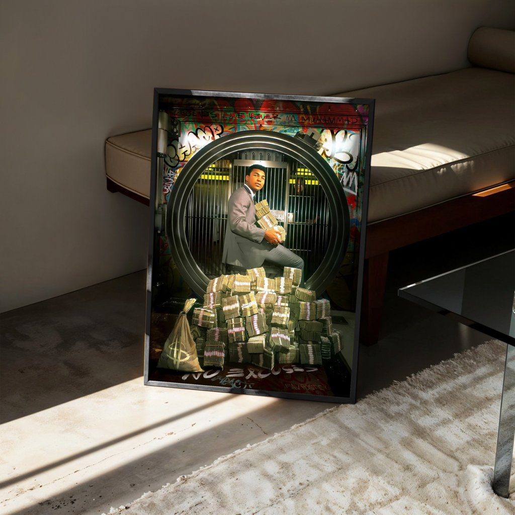 Motivační plakát s ikonickým Muhammadem Alim – symbolem nezdolnosti, sebevědomí a vítězné mentality. „No Excuses“ není jen nápis, ale životní postoj. Prostorová scéna plná peněz jen podtrhuje jeho přístup: Mysli ve velkém. Žij naplno. 💼🔥