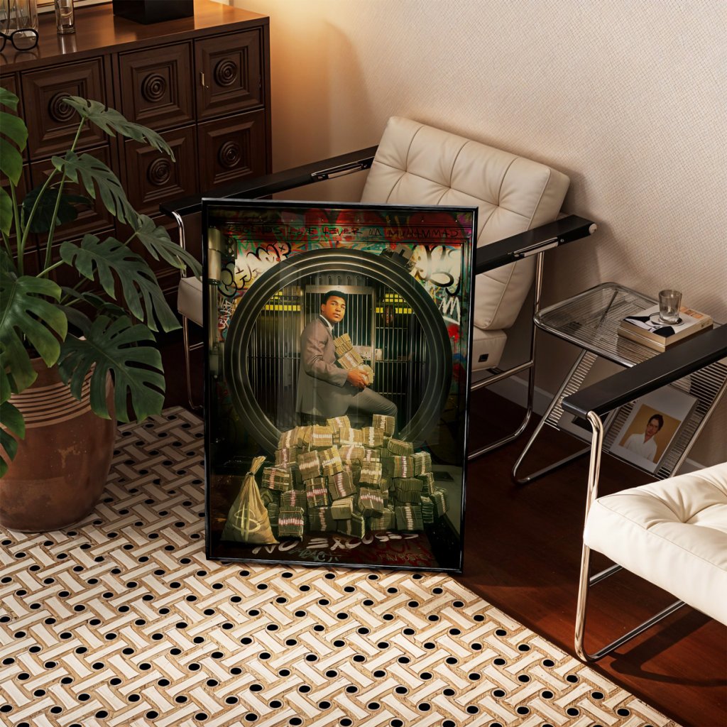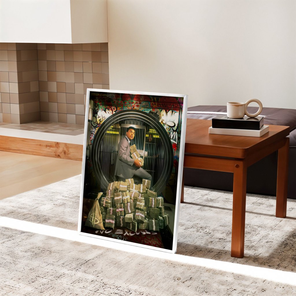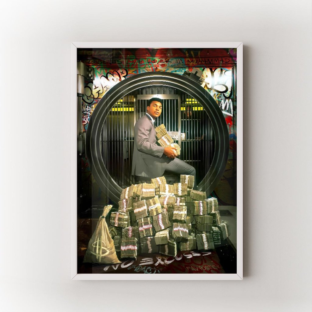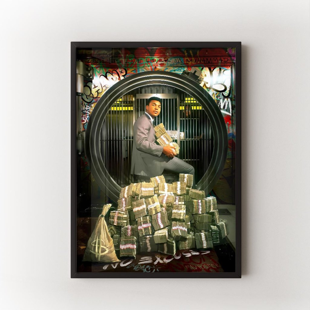 Motivační plakát s ikonickým Muhammadem Alim – symbolem nezdolnosti, sebevědomí a vítězné mentality. „No Excuses“ není jen nápis, ale životní postoj. Prostorová scéna plná peněz jen podtrhuje jeho přístup: Mysli ve velkém. Žij naplno. 💼🔥