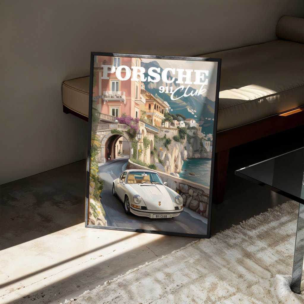 Club 911 - ikonické Porsche 911 na pobřeží Amalfi – symbol nadčasové elegance, klidu a old money životního stylu. Vintage atmosféra, precizní design a pocit svobody bez okázalosti dělají z tohoto plakátu stylový statement pro ty, kteří vědí, že skutečný luxus je tichý.