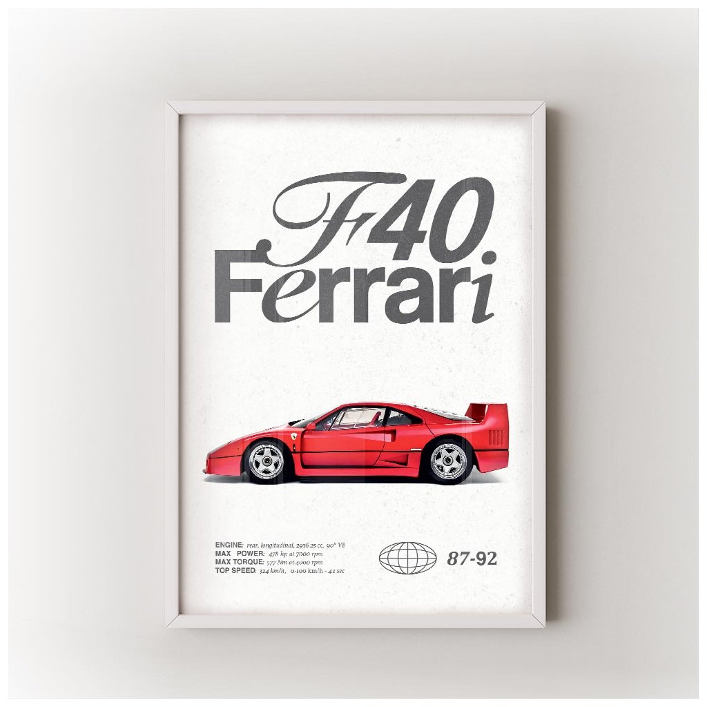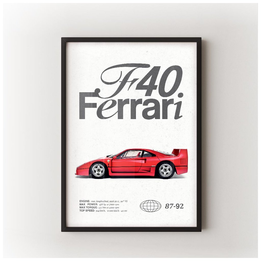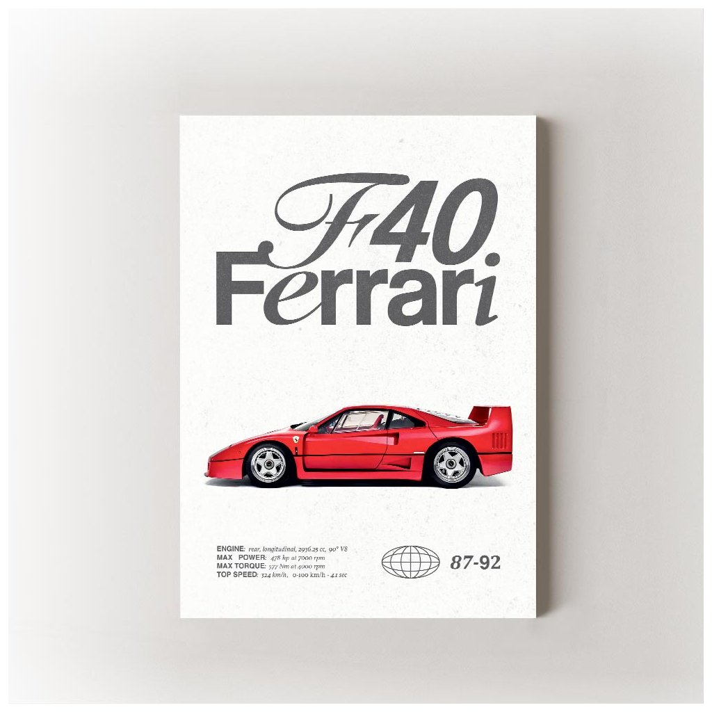 Nejlegendárnější supersport 80. let – Ferrari F40. Tento plakát zachycuje jeho nadčasový design, agresivní aerodynamiku a závodní DNA. Ikona rychlosti a výkonu, která nesmí chybět ve sbírce žádného fanouška Ferrari.