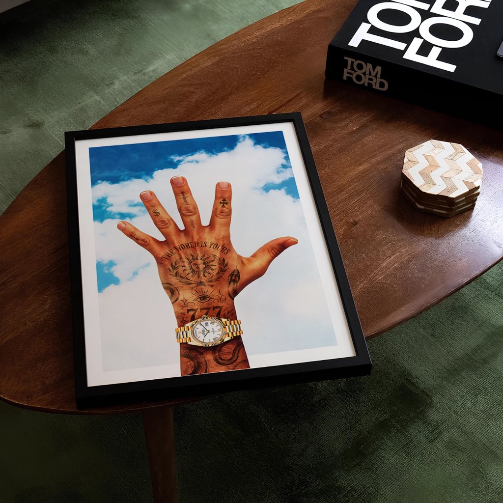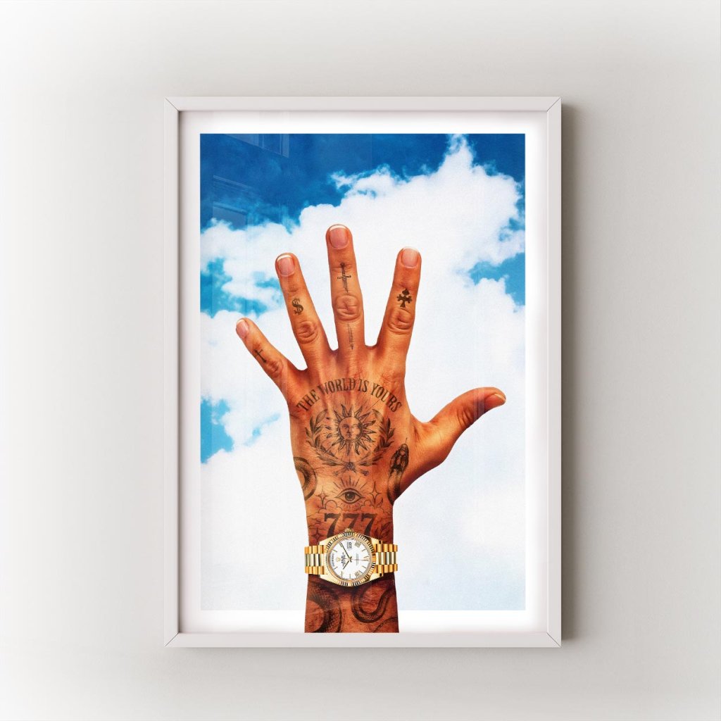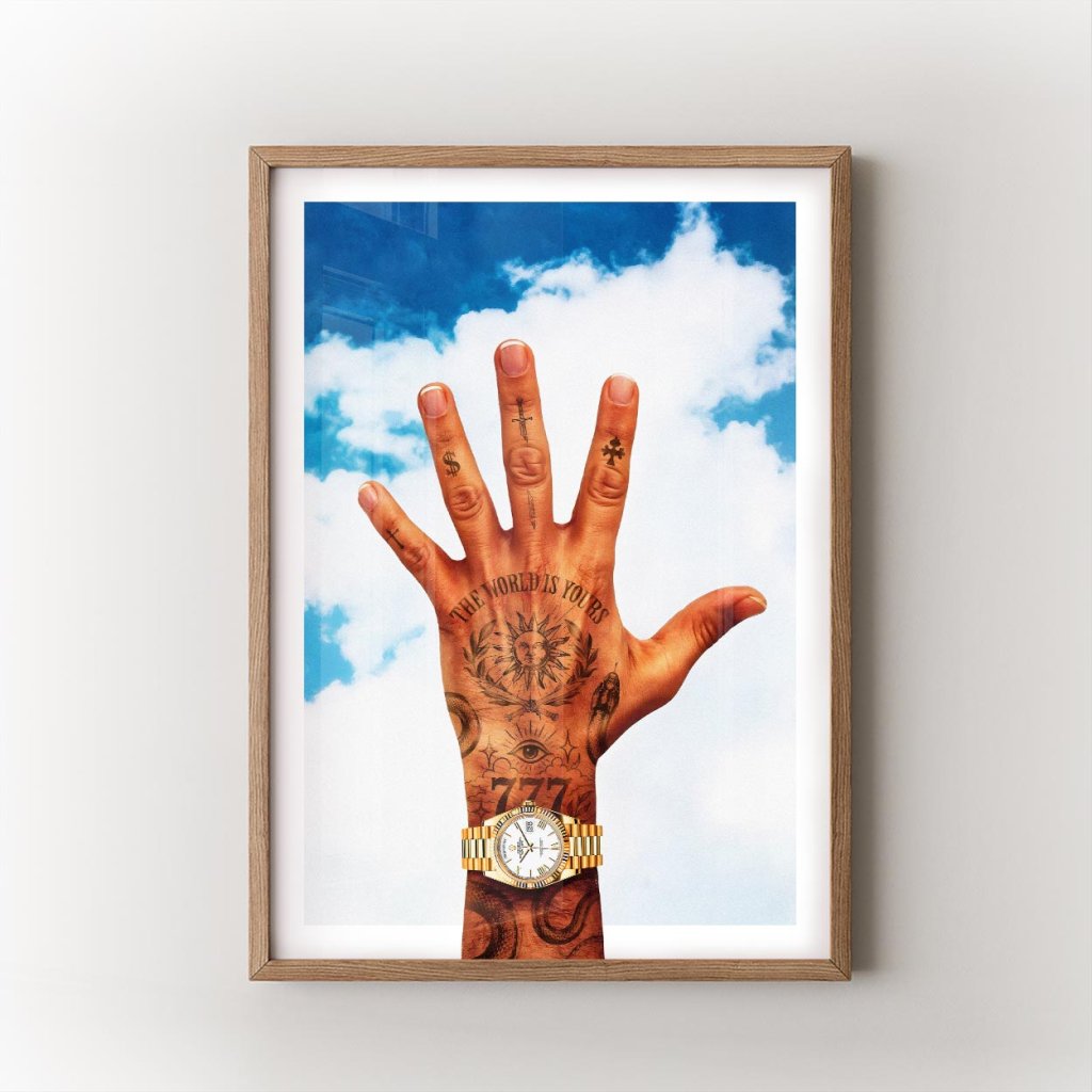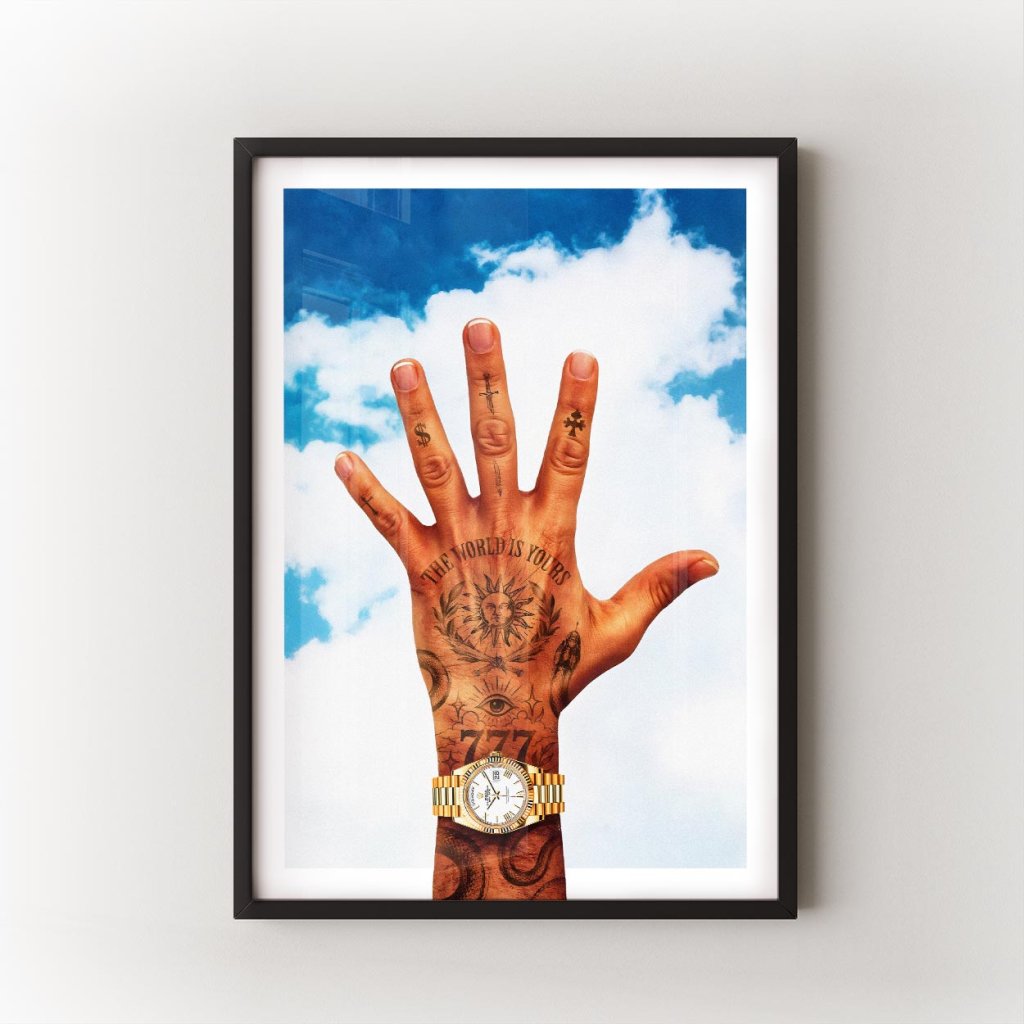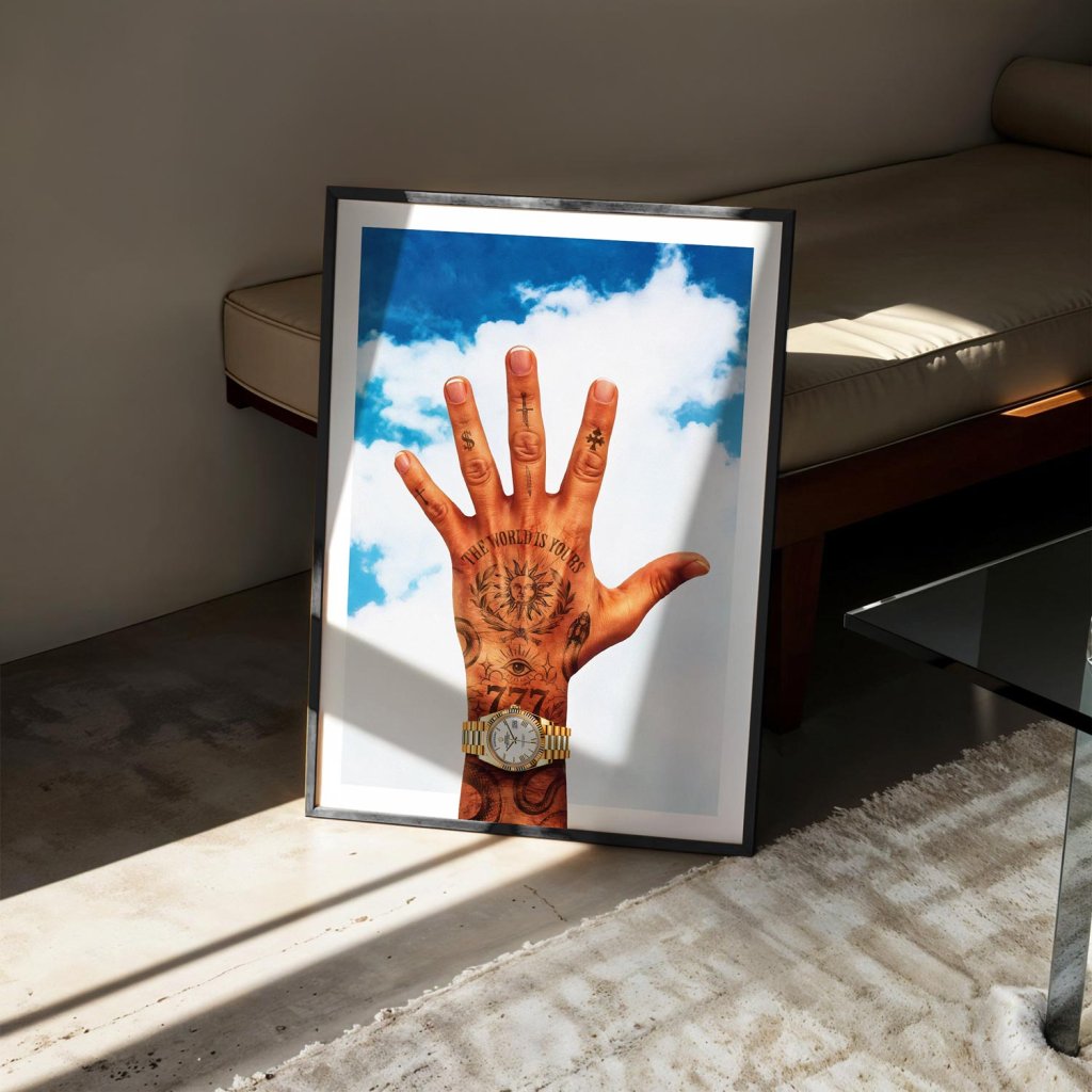 Plakát Hustle Time je vizuální manifest sebevědomí, ambicí a luxusu. Symbol Rolex hodinek na zápěstí představuje úspěch dosažený tvrdou prací a odhodláním, zatímco tetování The World Is Yours připomíná, že svět patří těm, kteří se nevzdávají.
