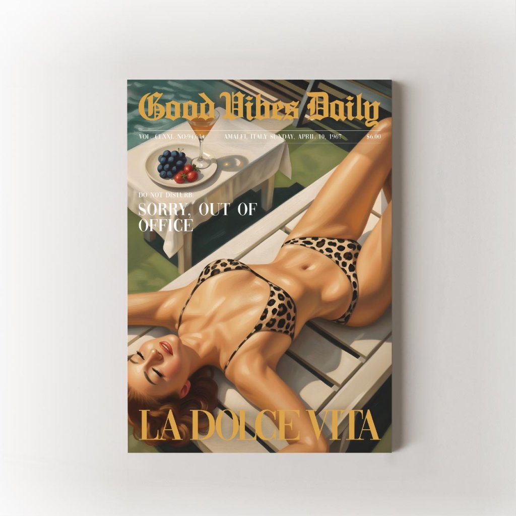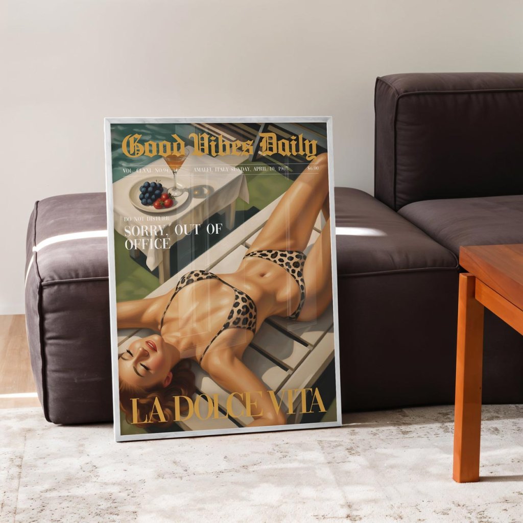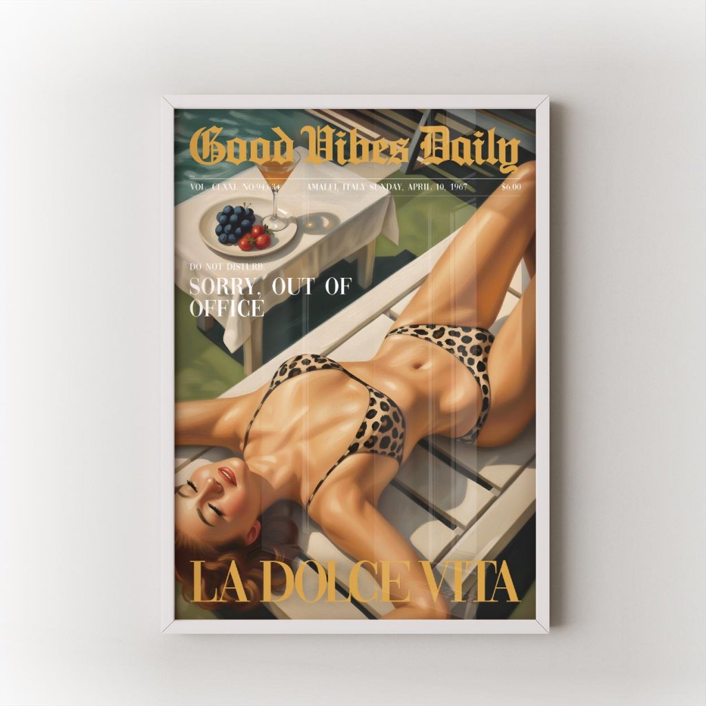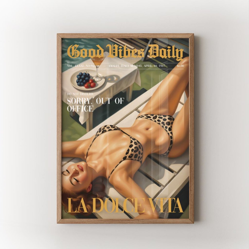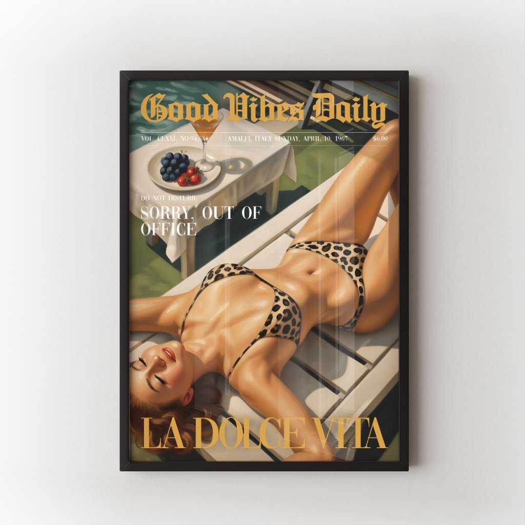 Tohle není jen vizuál – to je životní styl. La Dolce Vita je plakát pro všechny, kdo si umí vychutnat každý moment, zpomalit, vypnout a zhluboka se nadechnout. Vibe z 60. let s dotekem současného luxusu ti připomene, že život je o radosti, klidu a dobrých vibracích.