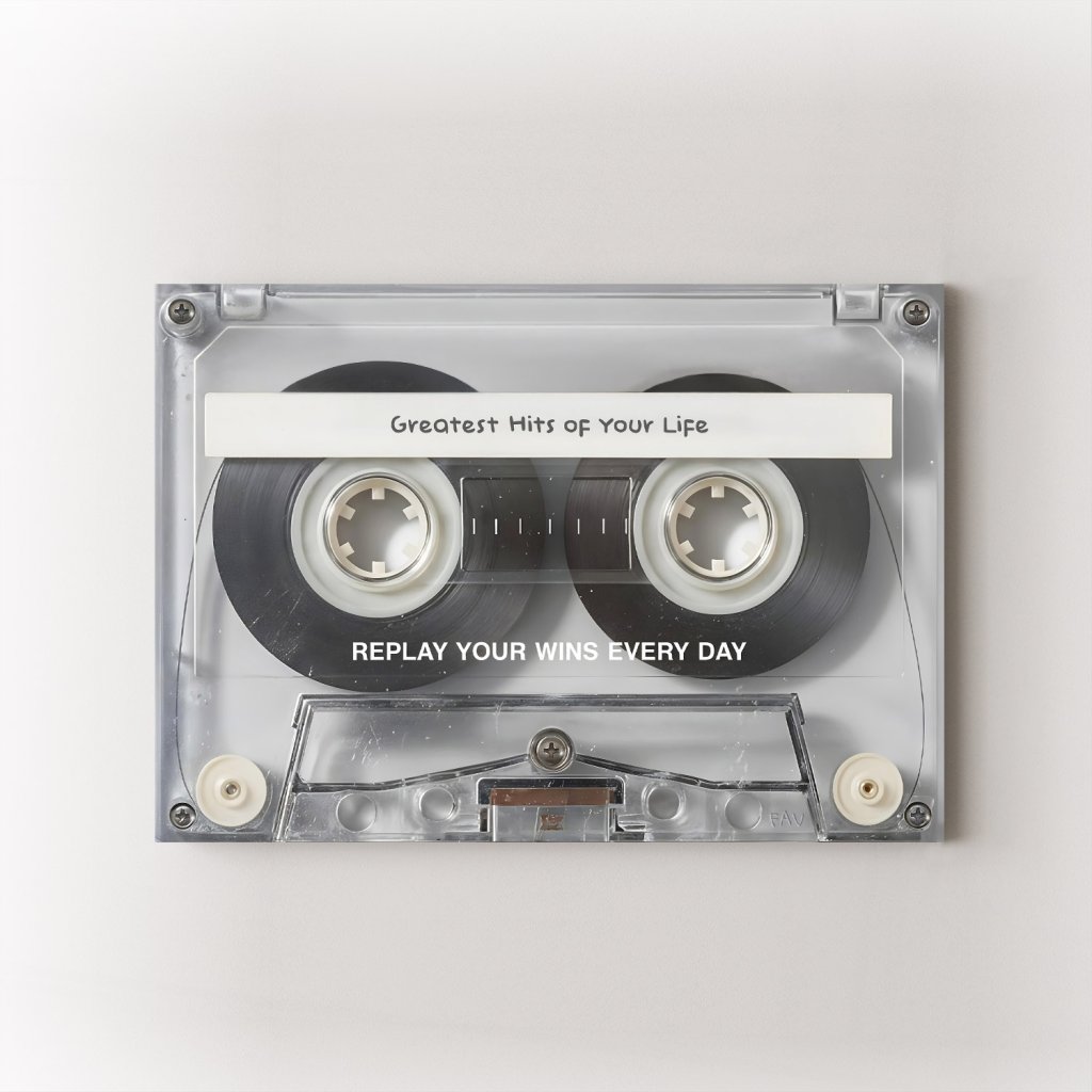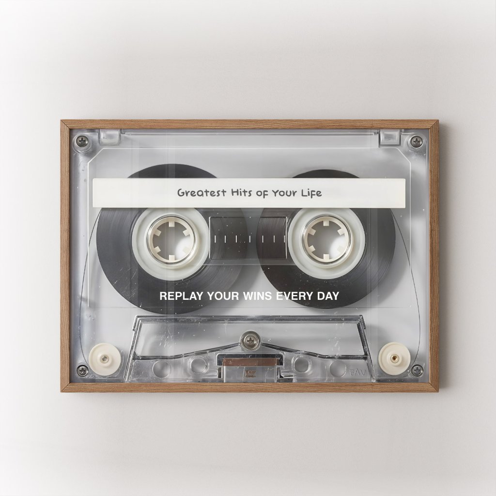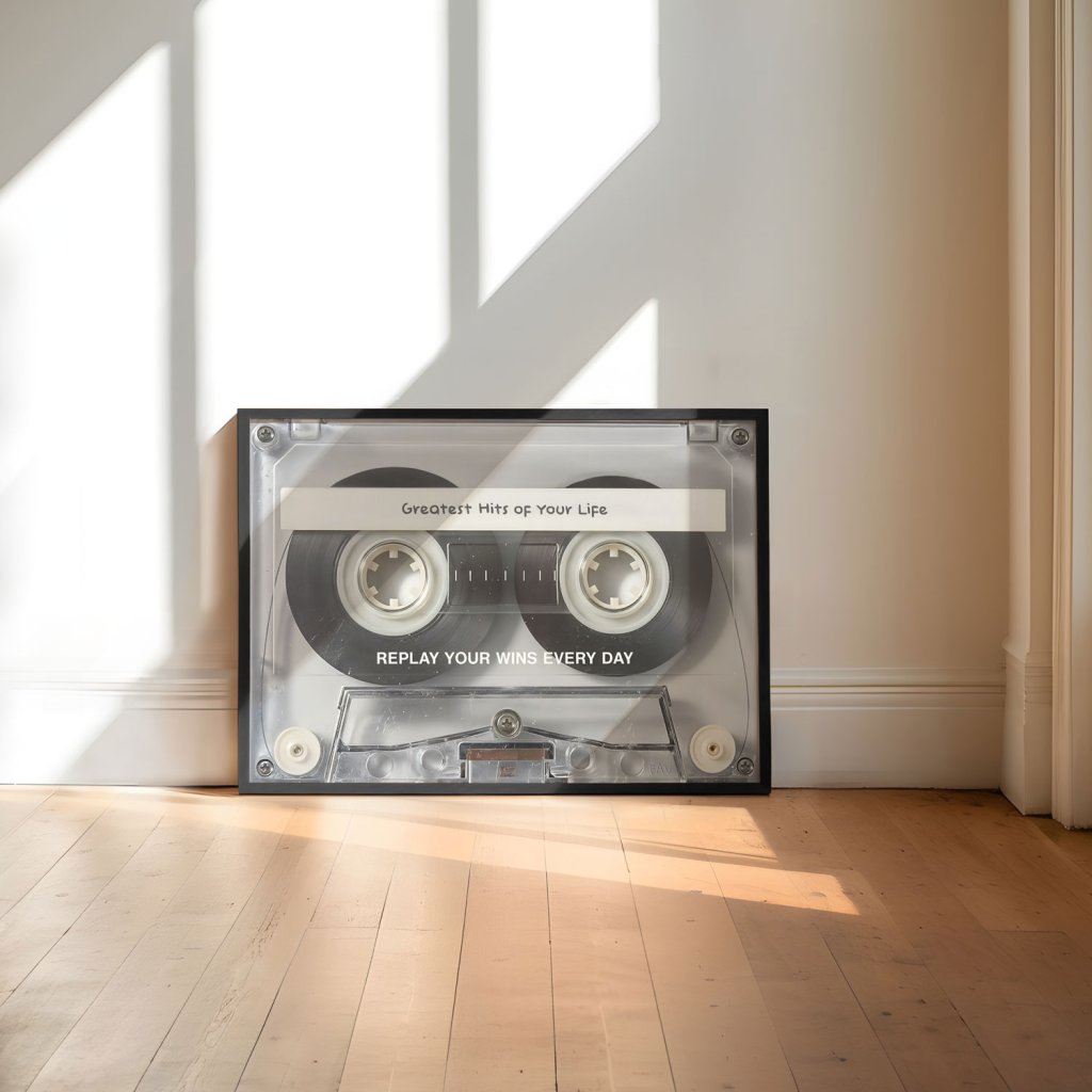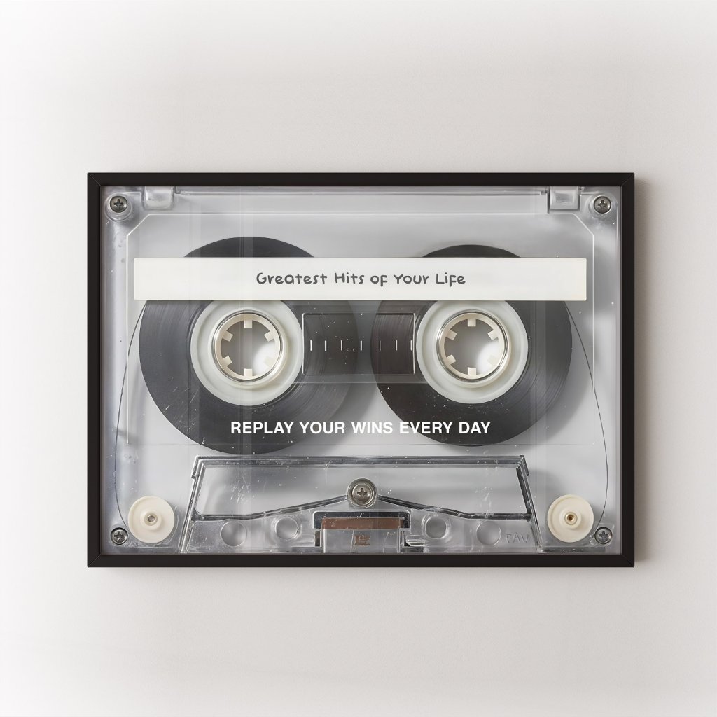 Každý úspěch má svůj rytmus. Tento motivační plakát Greatest Hits of Your Life pracuje s nostalgií kazetového pásku jako metaforou životních vítězství, která stojí za to si připomínat znovu a znovu. Text Replay Your Wins Every Day je silnou připomínkou, že sebevědomí, mindset a vnitřní pohon vznikají z toho, co už jsi dokázal.