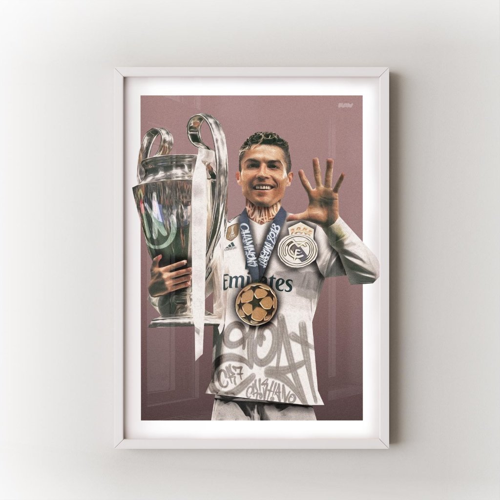 Legenda, která definovala éru! Tento exkluzivní plakát zachycuje Cristiana Ronalda s jeho pátou trofejí Ligy mistrů v dresu Realu Madrid. Moderní street-artový styl dodává ikonickému momentu jedinečný nádech.