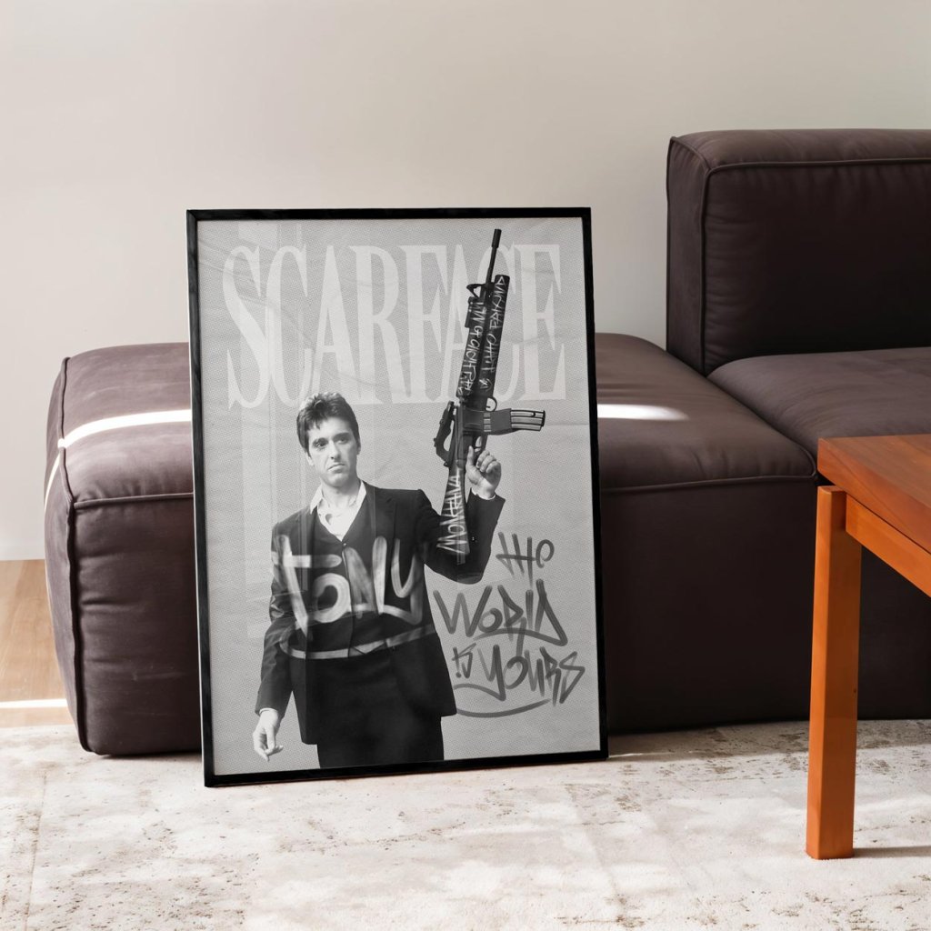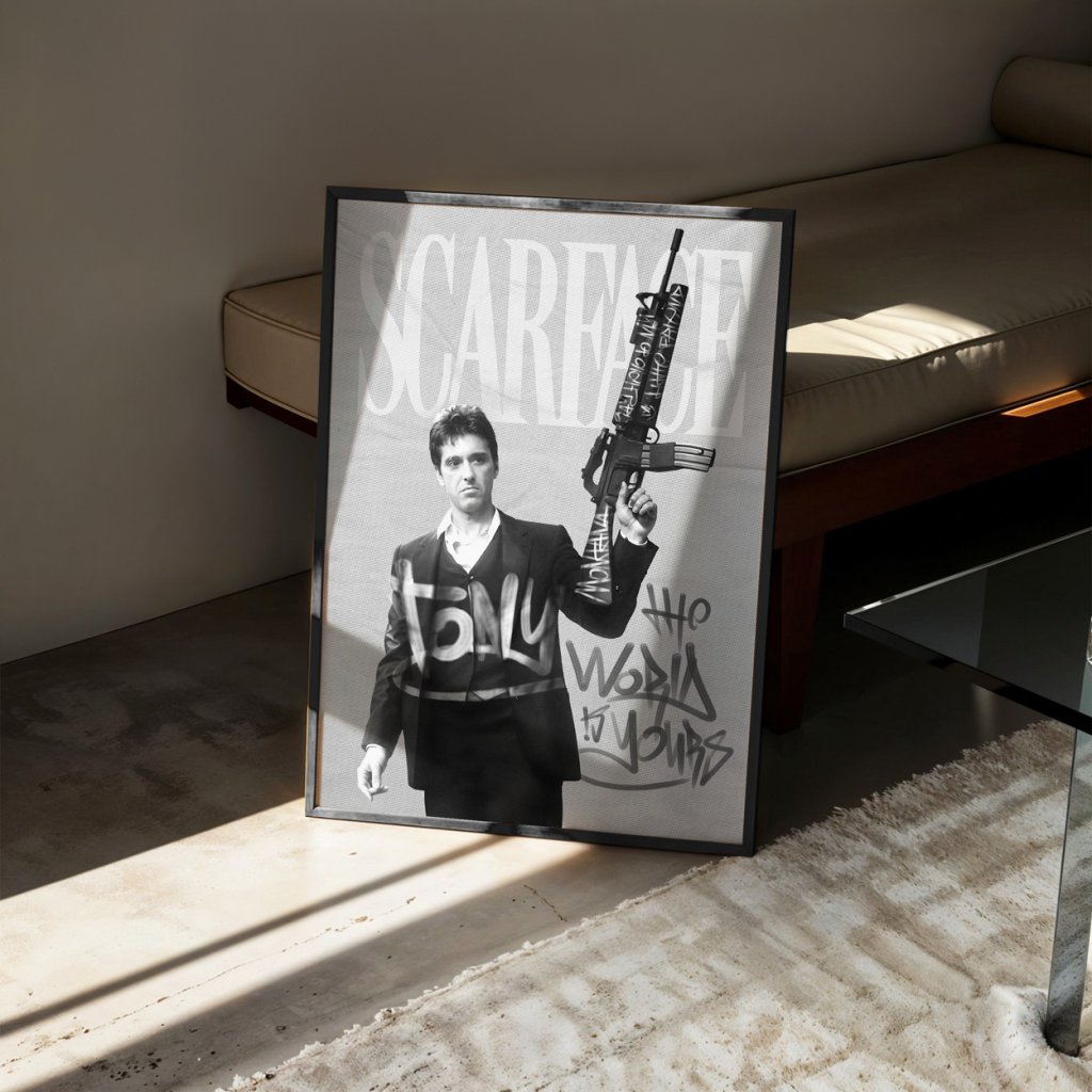 Plakát s nezapomenutelným Tony Montanou a jeho slovy "The World Is Yours" je perfektním doplňkem pro každého, kdo hledá inspiraci a motivaci. Ikonický design připomíná odhodlání a touhu dosáhnout všech cílů, které si člověk stanovil.