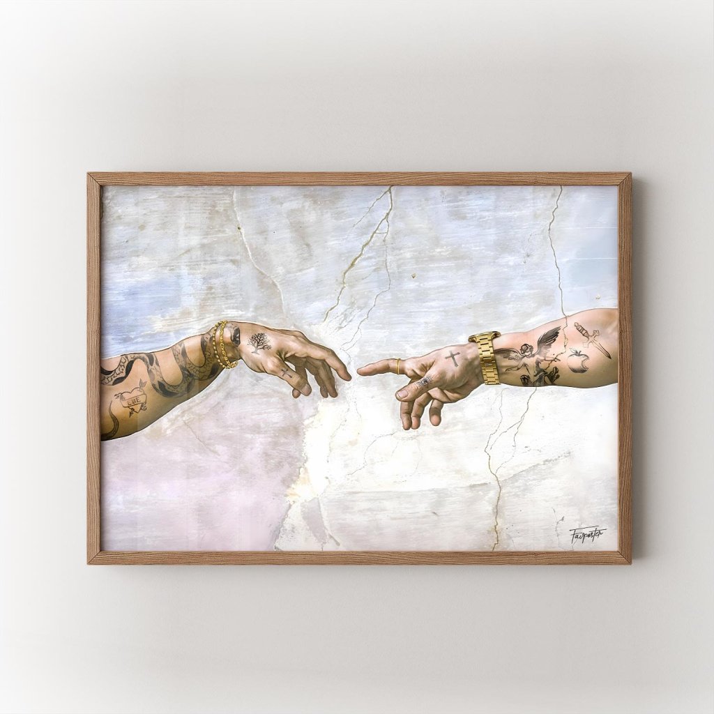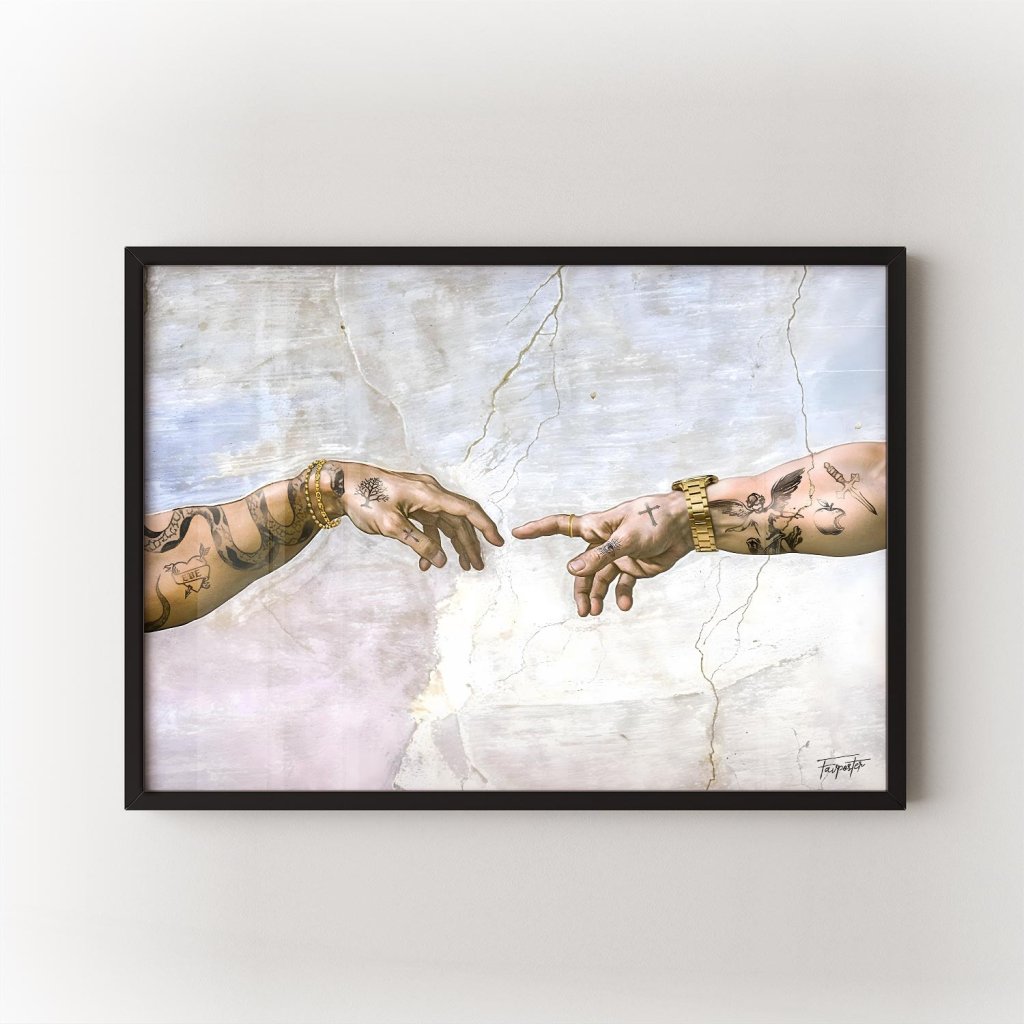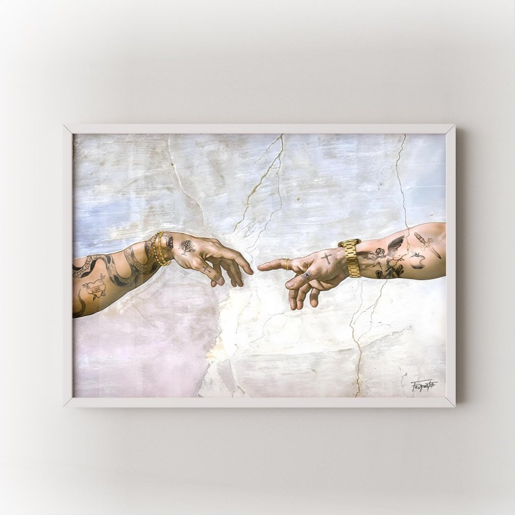 Zrození Adama v současném pojetí, kde se klasické umění potkává s moderní estetikou. Tento plakát přináší novou interpretaci ikonické scény – ruce Adama a Boha, tentokrát ozdobené tetováním, které odkazuje na příběh o Adamovi a Evě.