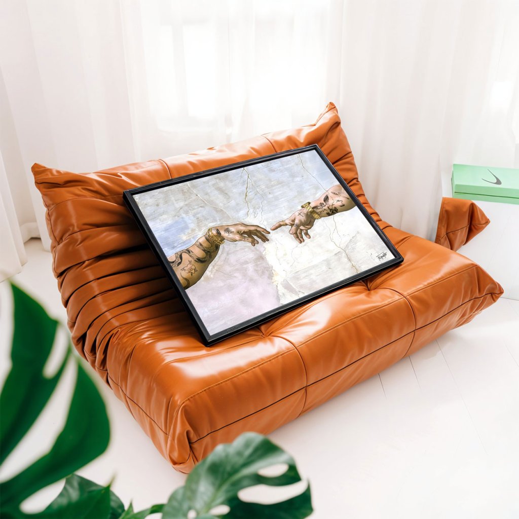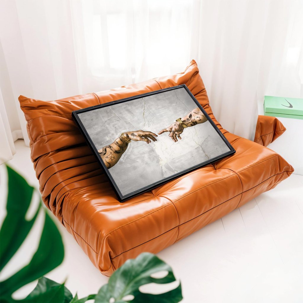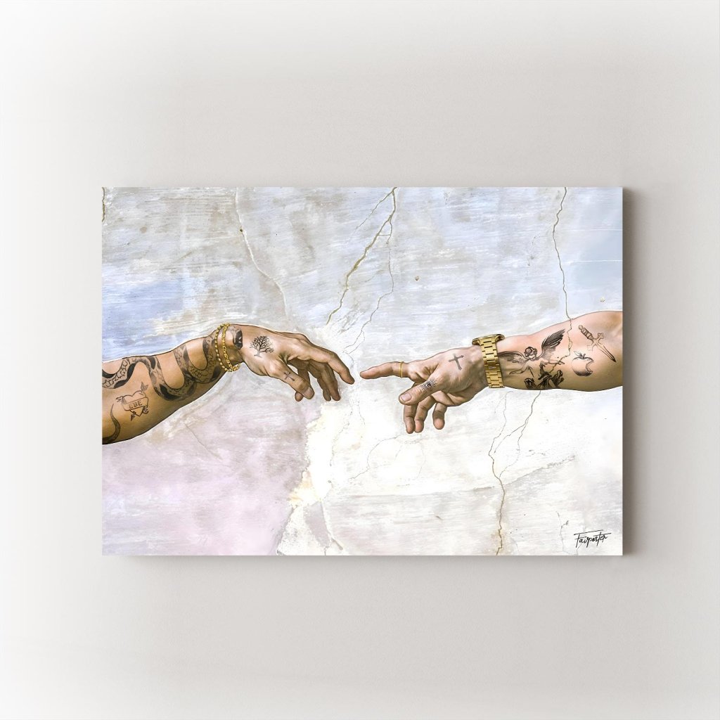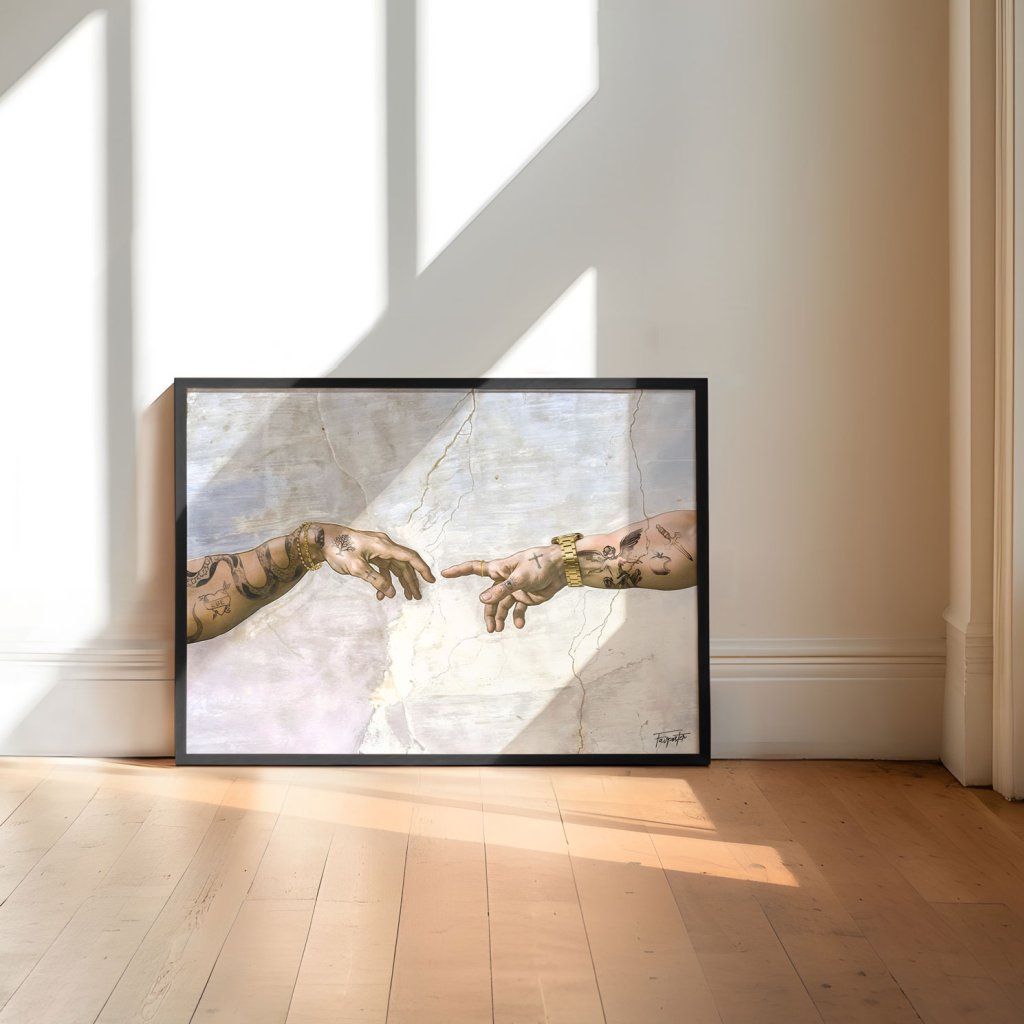 Zrození Adama v současném pojetí, kde se klasické umění potkává s moderní estetikou. Tento plakát přináší novou interpretaci ikonické scény – ruce Adama a Boha, tentokrát ozdobené tetováním, které odkazuje na příběh o Adamovi a Evě.