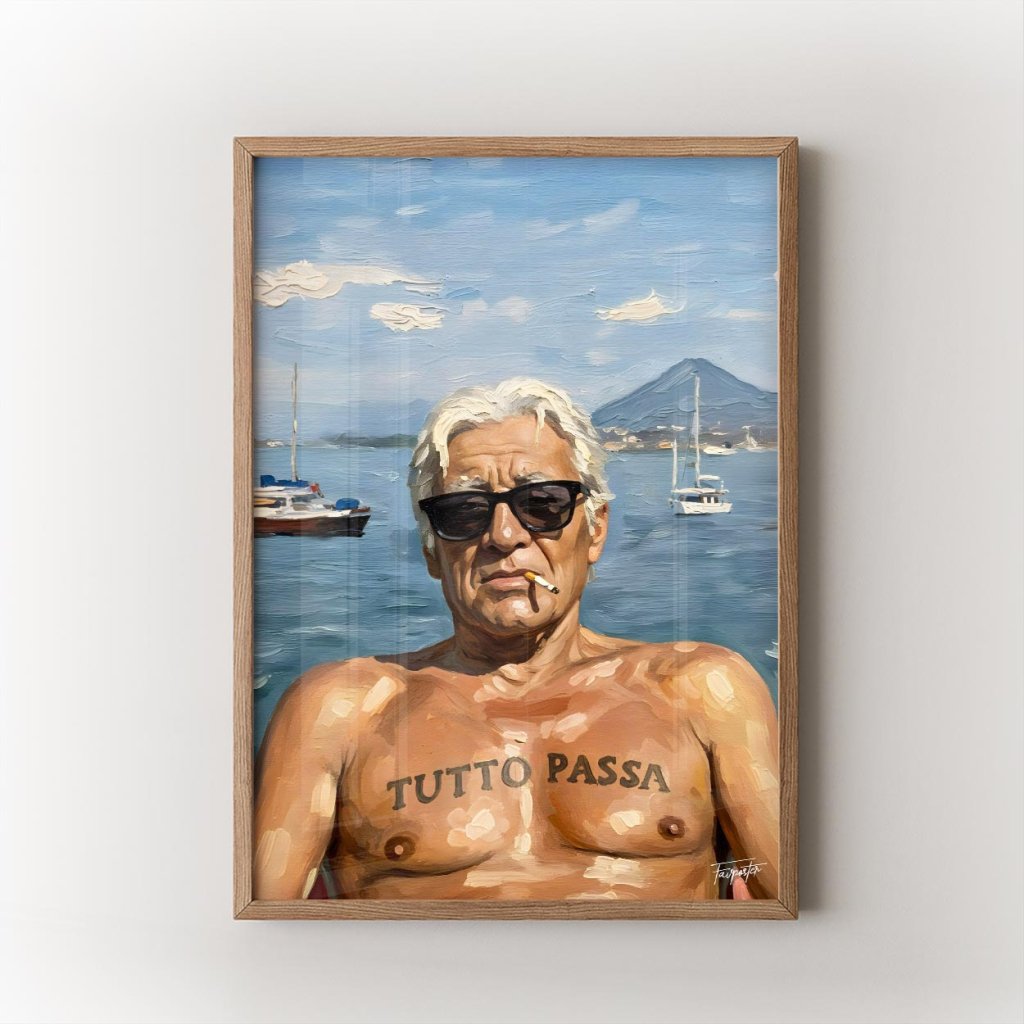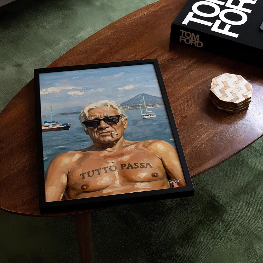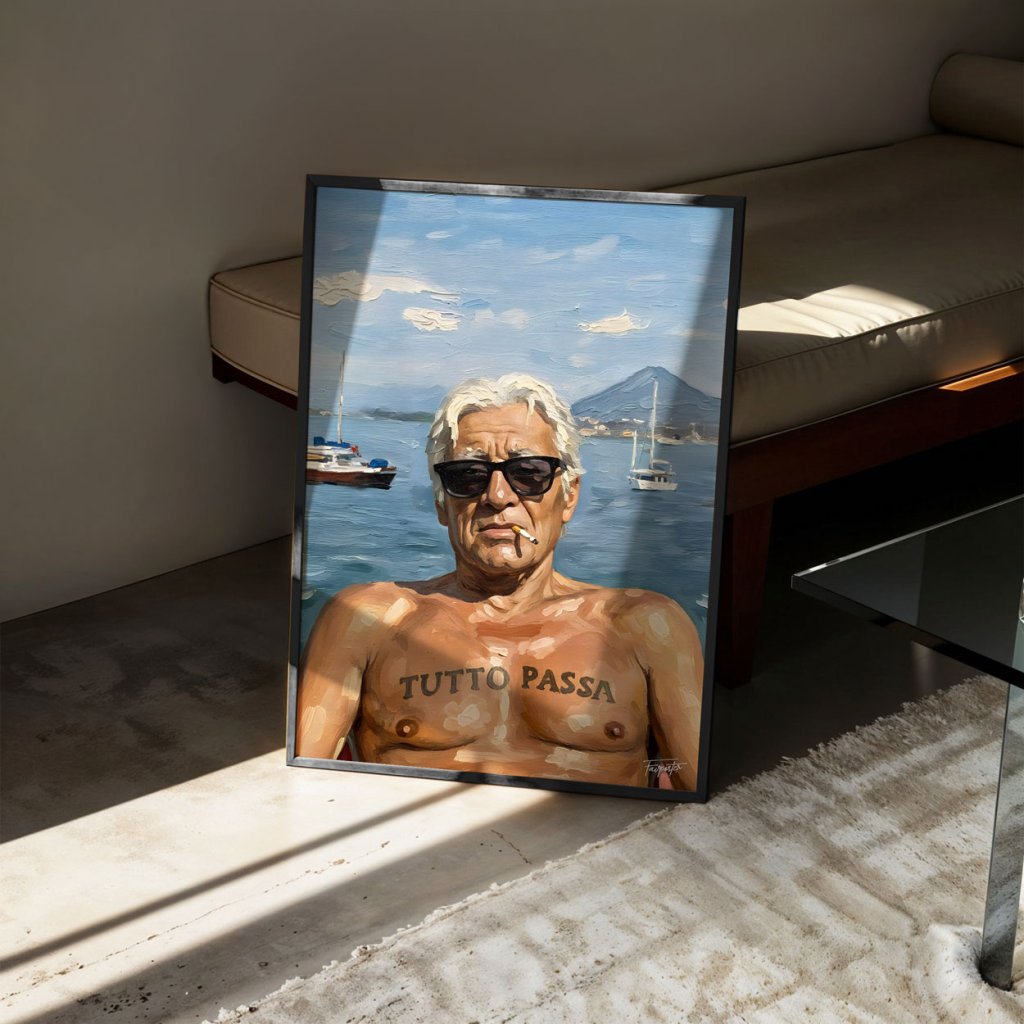 Plakát „Tutto Passa“ nese v sobě filozofii – užívat si života, i když vše pomíjí. Fráze „Tutto Passa“ znamená „všechno pomine“ a připomíná, že čas plyne, ale styl, charizma a životní postoj zůstávají. Tento plakát kombinuje old money estetiku, lehkou rebélii a atmosféru středomořské pohody. Ideální pro ty, kdo chtějí do interiéru vnést víc než jen dekoraci – chtějí příběh a životní moudrost.