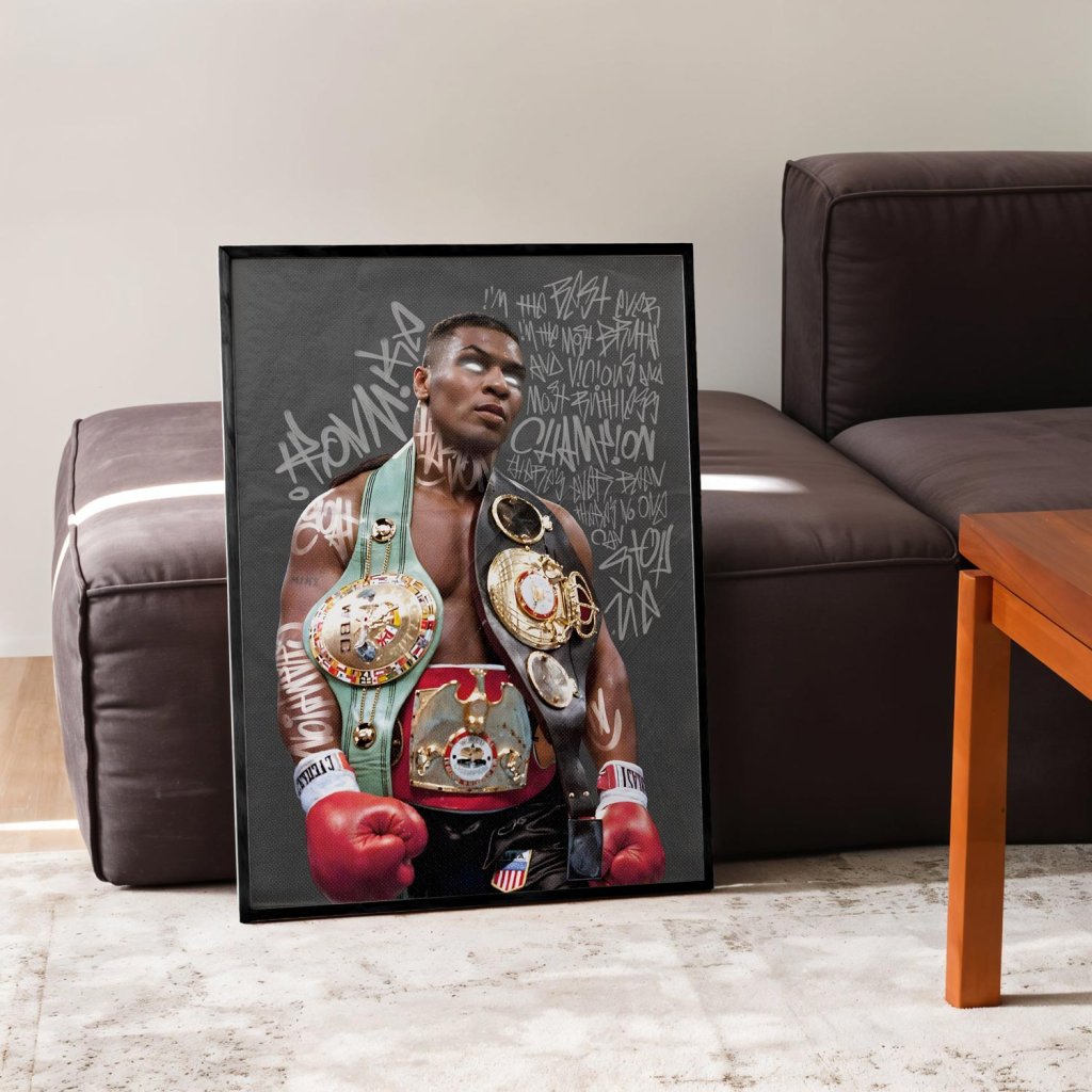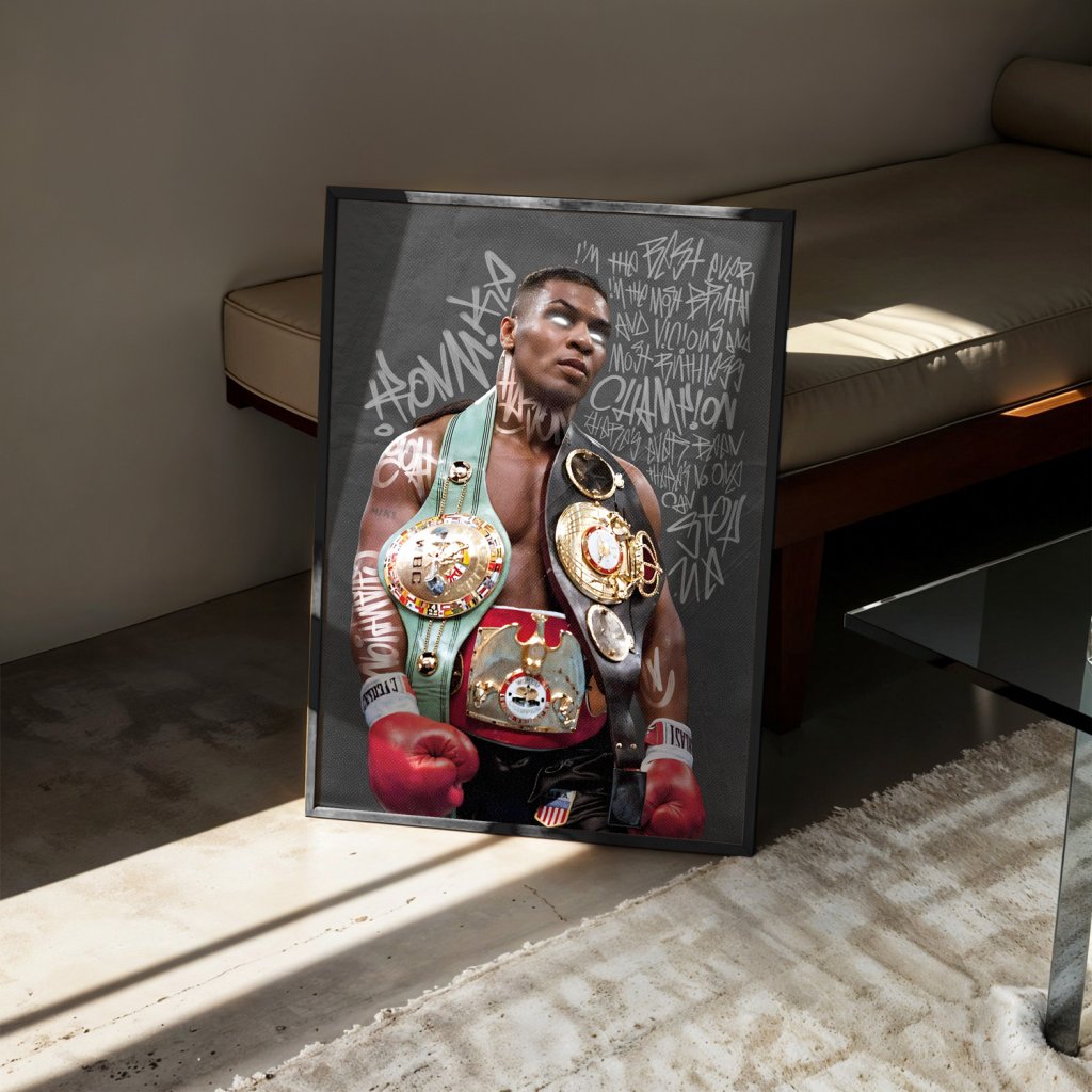Nezastavitelná síla, nezkrotná energie, absolutní legenda! Tento jedinečný plakát zachycuje mladého Mikea Tysona v jeho nejdominantnější éře – obklopeného tituly a doplněného ikonickým citátem: